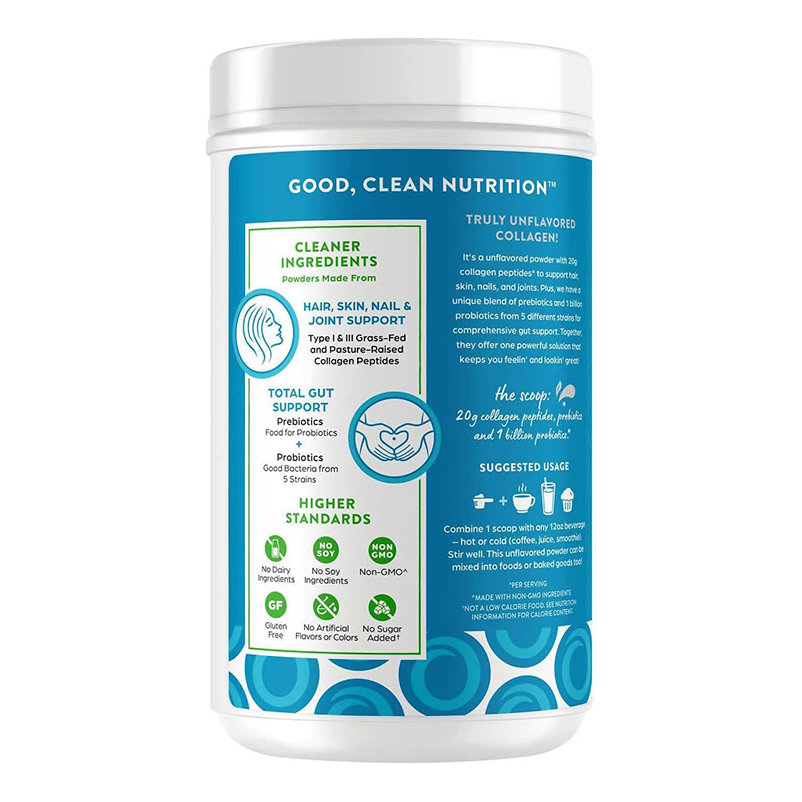 Collagen Peptides + Prebiotics and Probiotics is an unflavored powder with 20g of collagen peptides* to support hair, skin, nails, and joints.† Plus, we have a unique blend of prebiotics and 1 billion* probiotics for comprehensive gut support.† Together, they offer one powerful solution that keeps your feelin’ and lookin’ great! Discover the benefits of collagen peptides today!